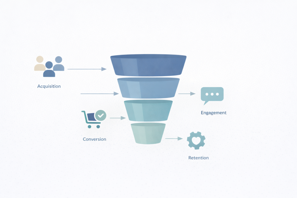 Analytics becomes useful when it reflects the full journey, not isolated touchpoints. A funnel connects acquisition, engagement, and conversion into a coherent view of how users move from first interaction to outcome.